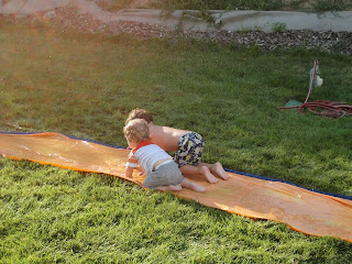 This is Lori my friends Mother who spent a few hours with me keeping the kids cool *she is flicking sno cone into his mouth* haha